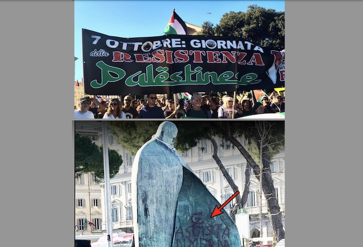 Il sito del Corriere della sera, ieri pomeriggio, titolava: “Roma, al corteo ProPal anche uno striscione sul 7 ottobre e bandiere di Hamas. Statua di Wojtyla imbrattata, Meloni: ‘indegno’”. E il sottotitolo: “Il corteo partito da Piazzale Ostiense. Identificate 60 persone con maschere antigas e mazze”.