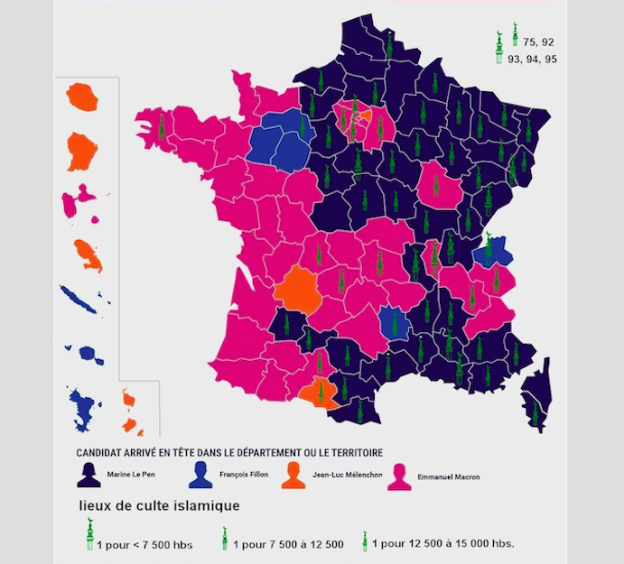 I dati del primo turno delle elezioni presidenziali francesi sono stati commentati in lungo e in largo, ma nessuno aveva pensato di sovrapporre la mappa dei Dipartimenti – con i relativi vincitori – alla mappa delle moschee presenti sul territorio francese.